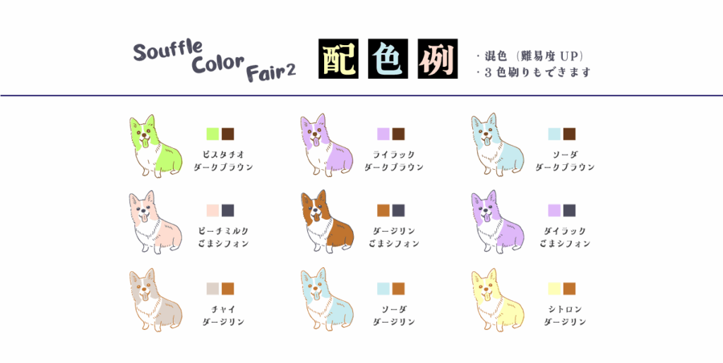 ・上記の色見本は白い用紙に印刷した際のイメージです。実際は用紙の地色や質感の影響を受けるため発色が変わります